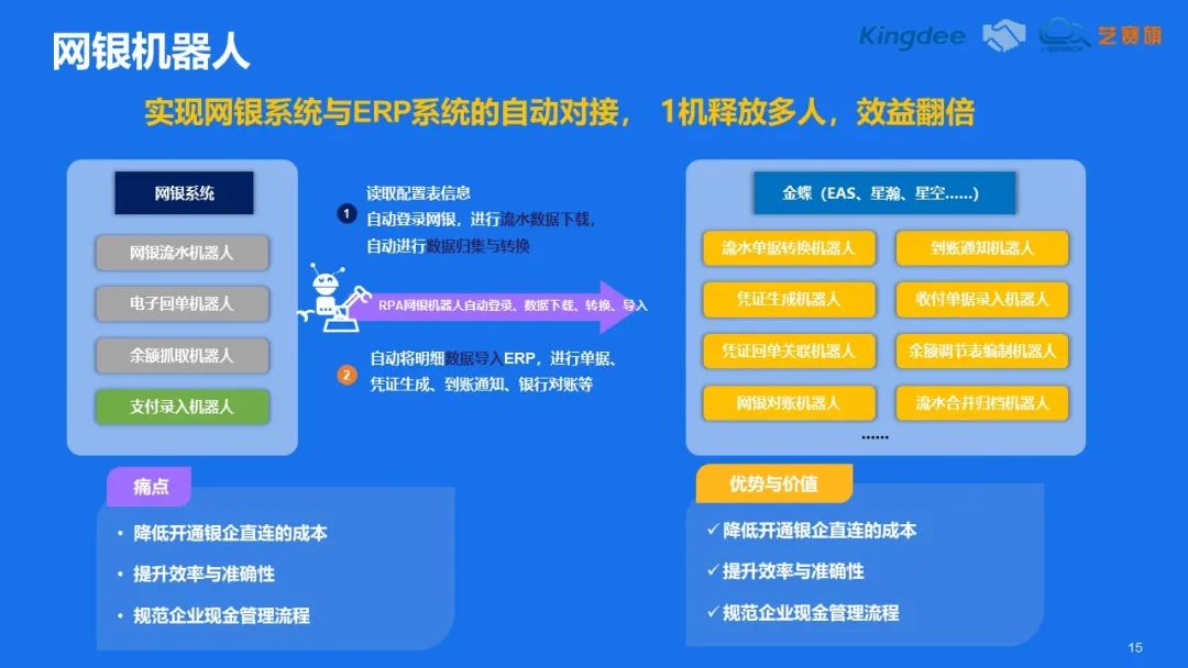 這里我們可以采取一種全新的思路,即利用RPA技術來實現企業內部系統與網銀數據的智能對接,藝賽旗網銀機器人(ren)可(ke)以(yi)模擬人(ren)工用(yong)戶的操作,自動登錄(lu)網銀平臺,獲(huo)取(qu)數(shu)據,然(ran)后(hou)將其(qi)傳輸到企(qi)(qi)業(ye)內部(bu)的ERP系統中(zhong),實現非(fei)銀企(qi)(qi)直連賬戶與財(cai)務系統的智能連接,包括自動獲(huo)取(qu)網銀的交易流水、余額、電(dian)子回單等(deng)任務,解決(jue)手動查詢錄(lu)入繁瑣的問題。網銀機器人不僅降低了企業開通銀企直聯的成本,還提高了操作的效率和準確性。