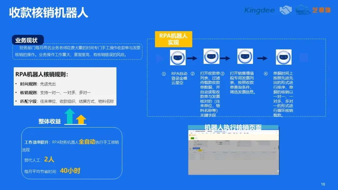 最(zui)后(hou)一個案(an)例涉及財務核(he)銷。這是一個(ge)廣(guang)泛應用于不(bu)同(tong)企(qi)業的(de)自(zi)動化需(xu)求,不(bu)同(tong)企(qi)業可能有不(bu)同(tong)的(de)核(he)(he)銷需(xu)求,但核(he)(he)心目標都是根(gen)據自(zi)身的(de)業務規則(ze)進行收款數(shu)據的(de)核(he)(he)銷。