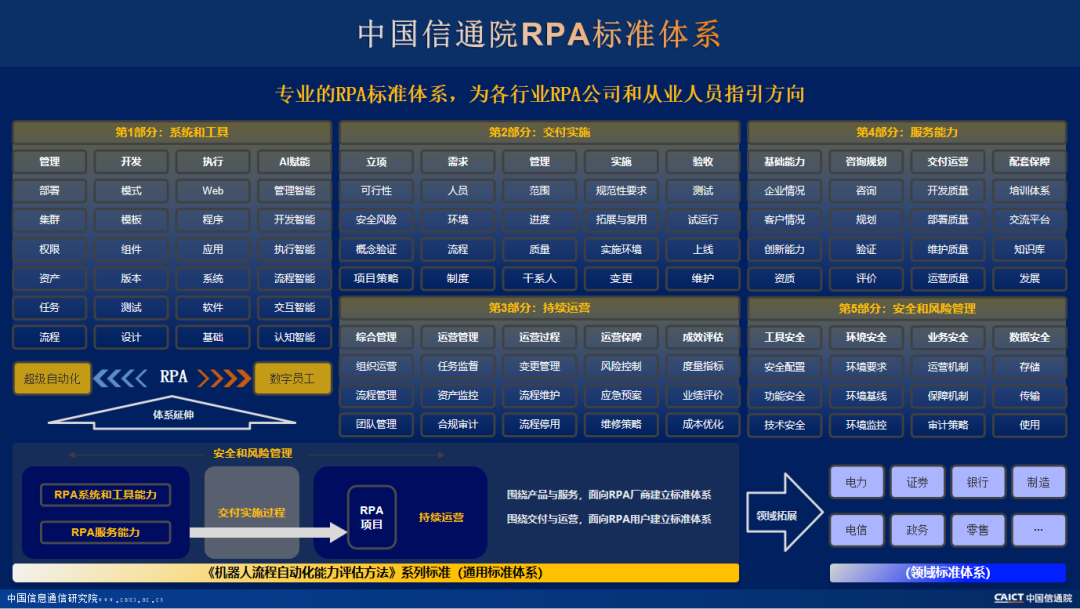中國信通(tong)院從2020年開始聯(lian)合包(bao)括藝賽旗在內的(de)80余(yu)家單位(wei)、200多位(wei)專家共同進行RPA相(xiang)關標準(zhun)制定(ding)工作,圍繞RPA的(de)(de)技術、應用、運(yun)營等要(yao)素(su),構建了(le)立體(ti)(ti)化的(de)(de)標(biao)準(zhun)體(ti)(ti)系,全(quan)面覆蓋(gai)RPA服務的(de)(de)全(quan)生命周期。