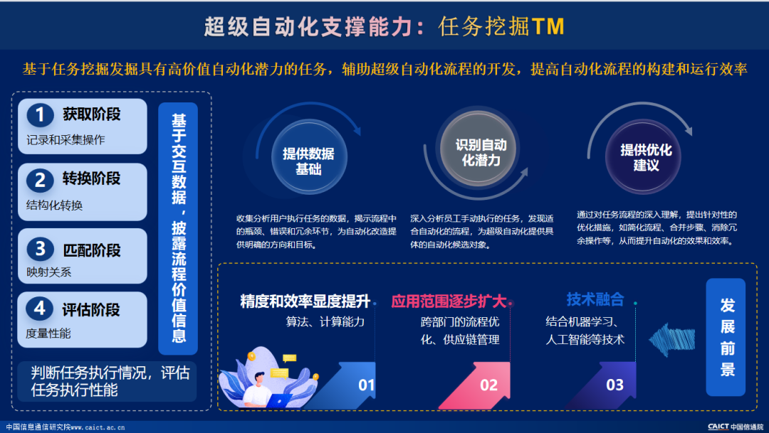 任務挖掘的發展前景十分廣闊,基于(yu)任務挖掘(jue)可以(yi)幫助企業發掘(jue)具(ju)有高價值自動化潛力的任務,輔(fu)助超級自動化流(liu)程(cheng)的開發,提(ti)高自動化流(liu)程(cheng)的構(gou)建和(he)運行效率。