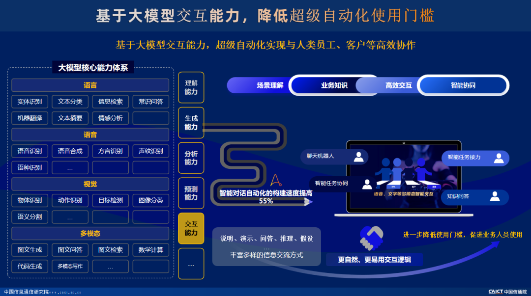 大模型(xing)的能力與超級自動(dong)化(hua)的技術(shu)需(xu)求非(fei)常匹配,同時(shi)也使得其逐漸成為超級自動(dong)化(hua)的新型(xing)技術(shu)底座。大模型(xing)的核心能力包括理解、生(sheng)成、分(fen)析、預測和(he)交互,涵蓋了語(yu)言(yan)、語(yu)音、視覺和(he)多模態的信(xin)息處理。