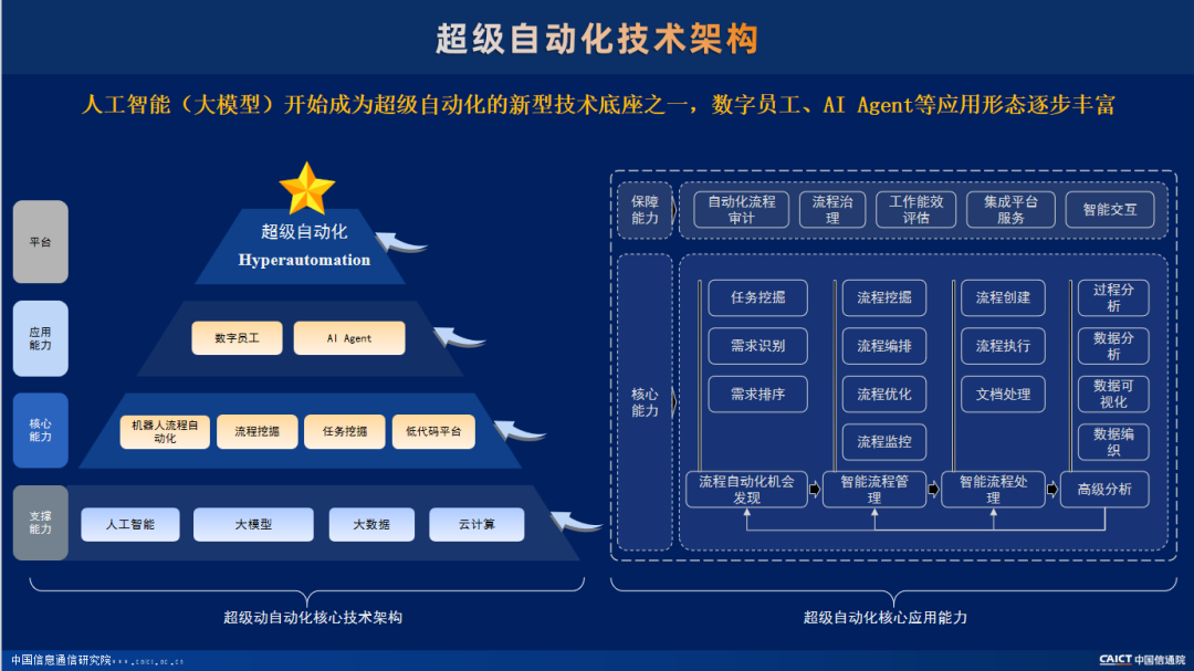 超(chao)級自動化關鍵技(ji)術主要包括RPA技(ji)術、流程挖掘和低代(dai)碼等相關技(ji)術。大(da)模型開始成(cheng)為(wei)超級自動化的技術底座之一(yi),相關的應用形(xing)態也在(zai)不(bu)斷豐(feng)富,包括數字員工、AI agent等(deng)。
