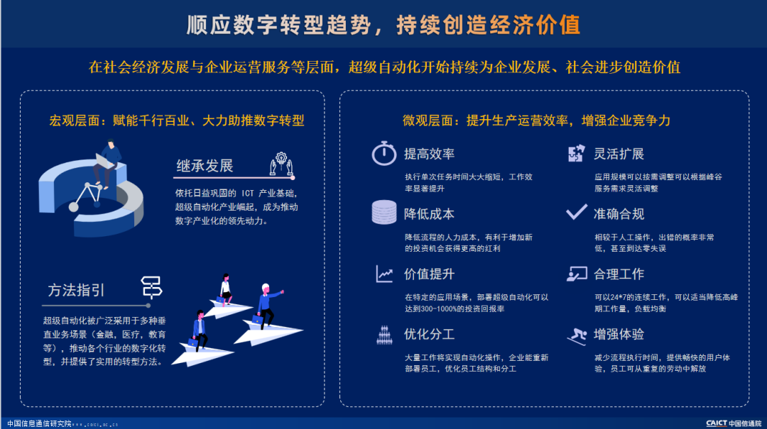 “數(shu)字員工”推(tui)動降本增(zeng)效,深度賦能經(jing)濟社(she)會數(shu)字化轉型,超自動化將進一步幫助企業進行流程優化、加速決策。