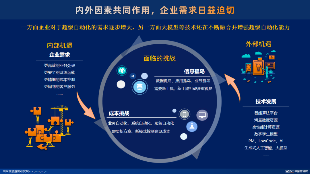 超(chao)(chao)級(ji)自動化技(ji)術的(de)發展是內外部因素共同推動的(de)結果,企業對于超(chao)(chao)級(ji)自動化的(de)需求(qiu)逐(zhu)步(bu)增大,此(ci)外大模型等技(ji)術還在不斷融(rong)合并增強超(chao)(chao)級(ji)自動化能力。