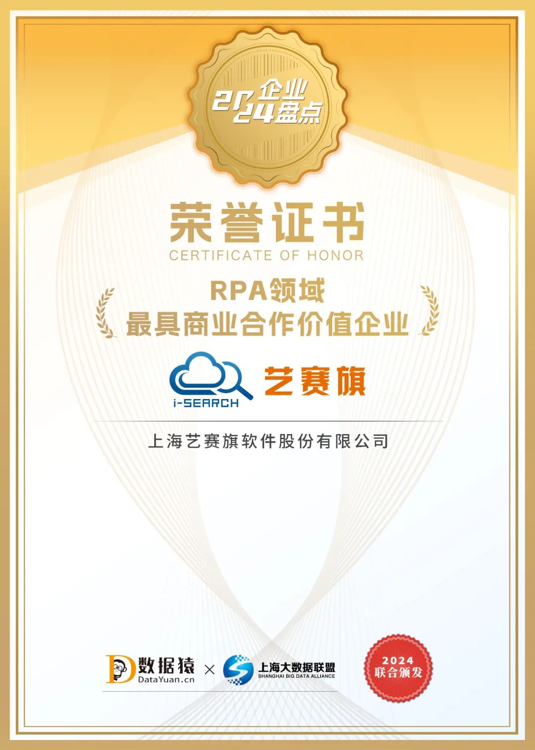 近(jin)日,數據猿正式發布《2024中國RPA領域最具商(shang)業合作價值企業》榜單,藝賽旗憑借自主研發的RPA成功入圍,獲評“2024中國RPA領域最(zui)具商(shang)業合(he)作(zuo)價值企業”。