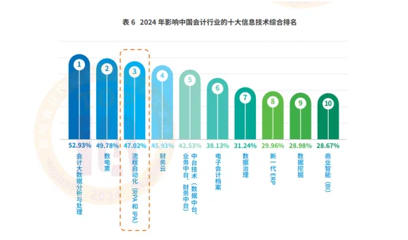 近期,上海國家(jia)會(hui)計(ji)學院(yuan)發布了2024年影響中國會(hui)計(ji)行業的十大信息技術評(ping)選結果。從(cong)綜合排(pai)名來看(kan),RPA作為賦能(neng)財務數字化轉型的重(zhong)要技術之一(yi),繼續蟬(chan)聯榜(bang)單,熱度不斷升溫(wen),牢牢占據榜(bang)單前三的位置!