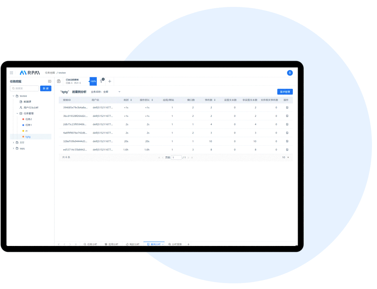 幫助企業深入、真實、準(zhun)確的(de)了(le)解員(yuan)工日常的(de)桌(zhuo)面操(cao)作行為,并及時發現和識(shi)別(bie)新(xin)的(de)自動化(hua)(hua)機會。它通過智能(neng)化(hua)(hua)拾取員(yuan)工的(de)桌(zhuo)面操(cao)作日志,如(ru):鼠標、鍵盤等操(cao)作,基(ji)于(yu)計算機視覺、機器學習、數據挖掘等技術對(dui)每個員(yuan)工的(de)操(cao)作數據進行分析(xi),快速(su)識(shi)別(bie)一切值得自動化(hua)(hua)的(de)高(gao)頻任務流。
